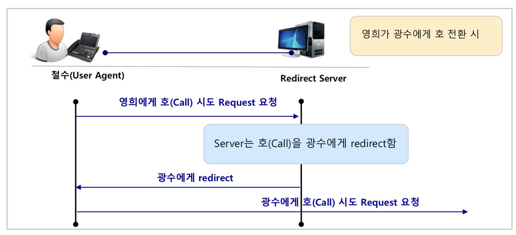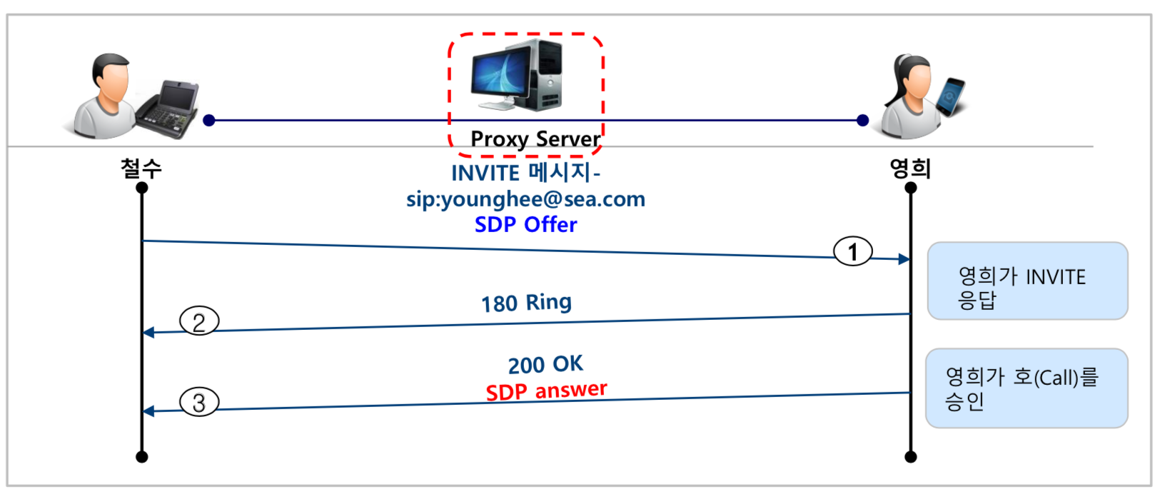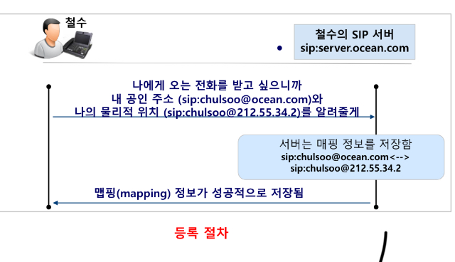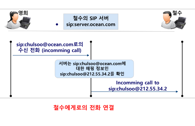 SIP등록 절차가 완료되면, 철수에게 오는 전화는 모두 특정 서버를 거쳐서 철수에게 도달하게 된다.