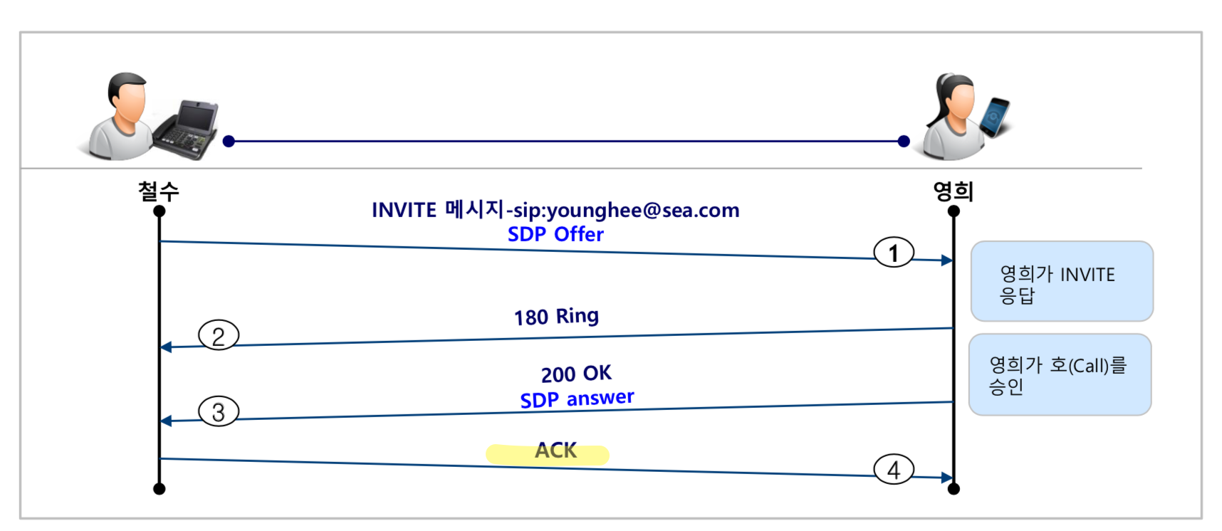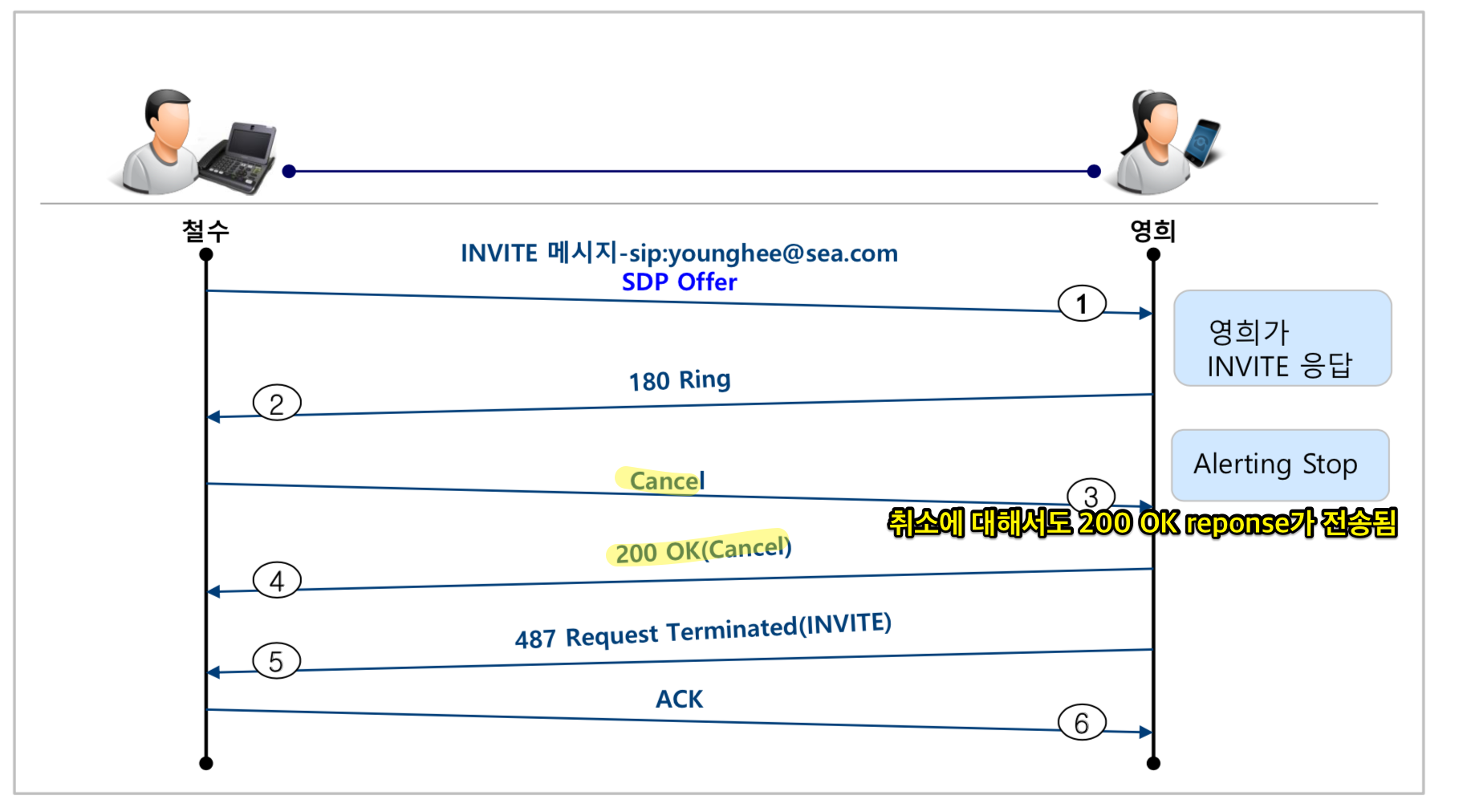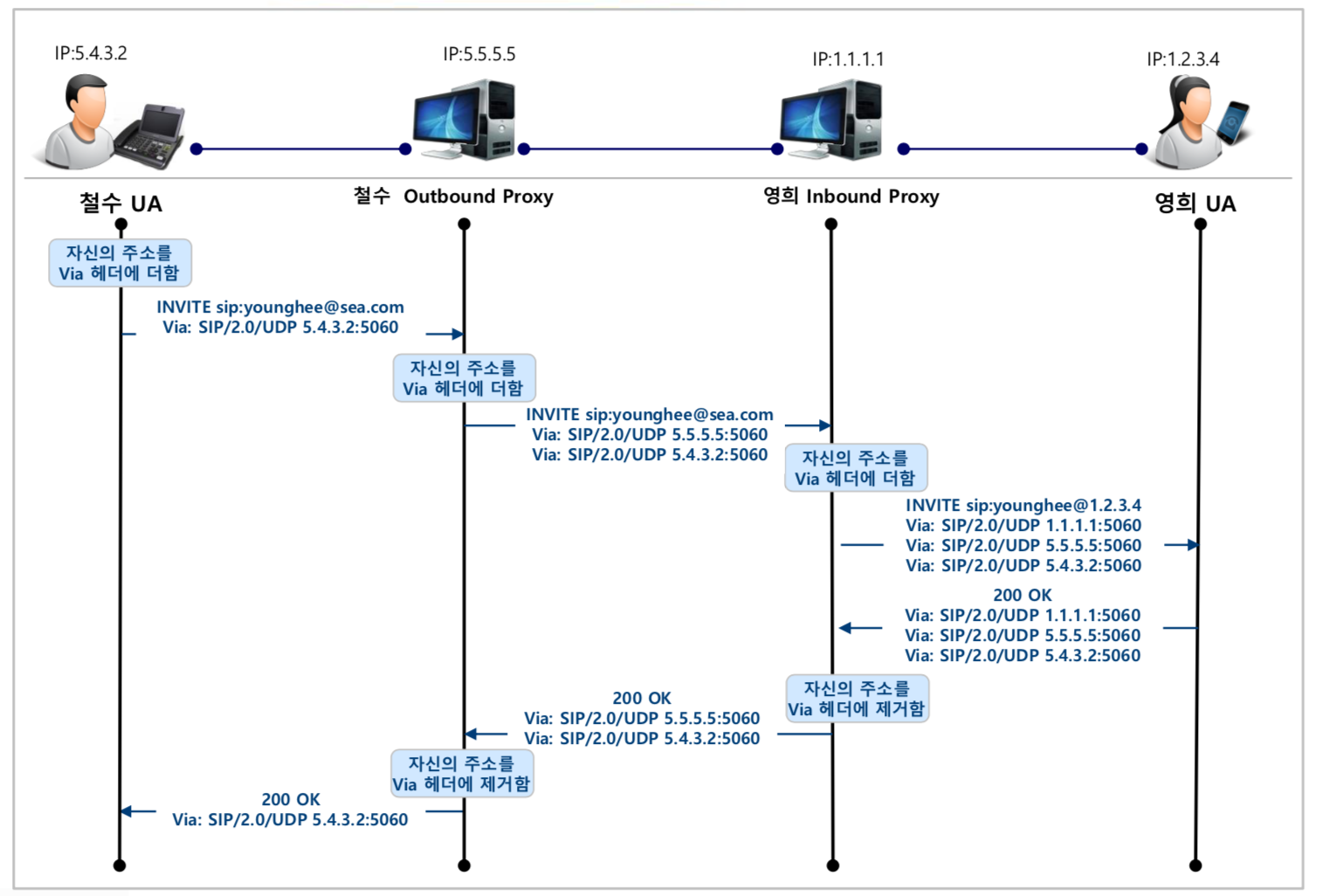 SIP등록 절차가 완료되면, 철수에게 오는 전화는 모두 특정 서버를 거쳐서 철수에게 도달하게 된다.
