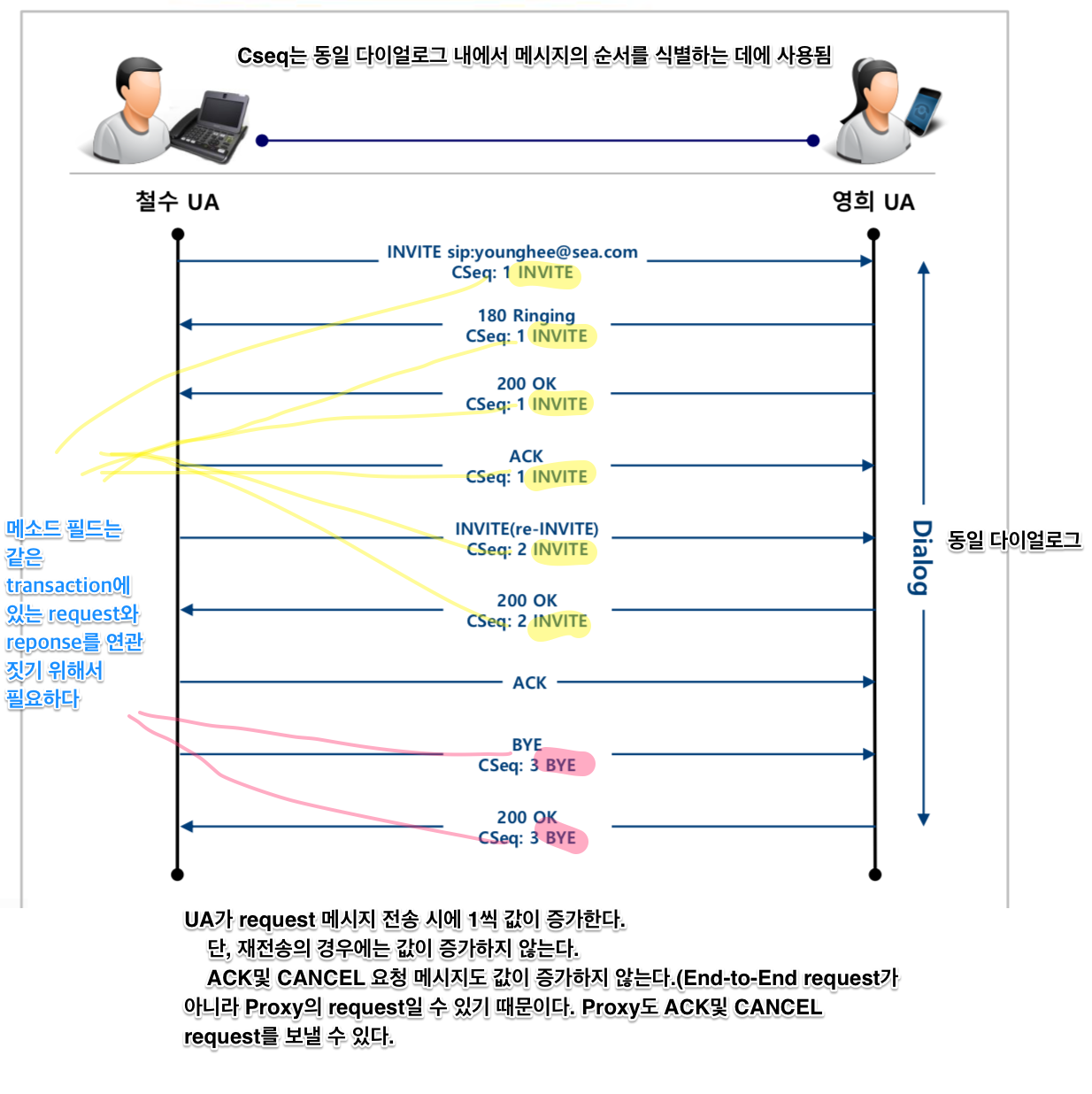 - Cseq는 순서번호(sequential number)와 메소드(method)로 구성된다; Cseq: 5 INVITE