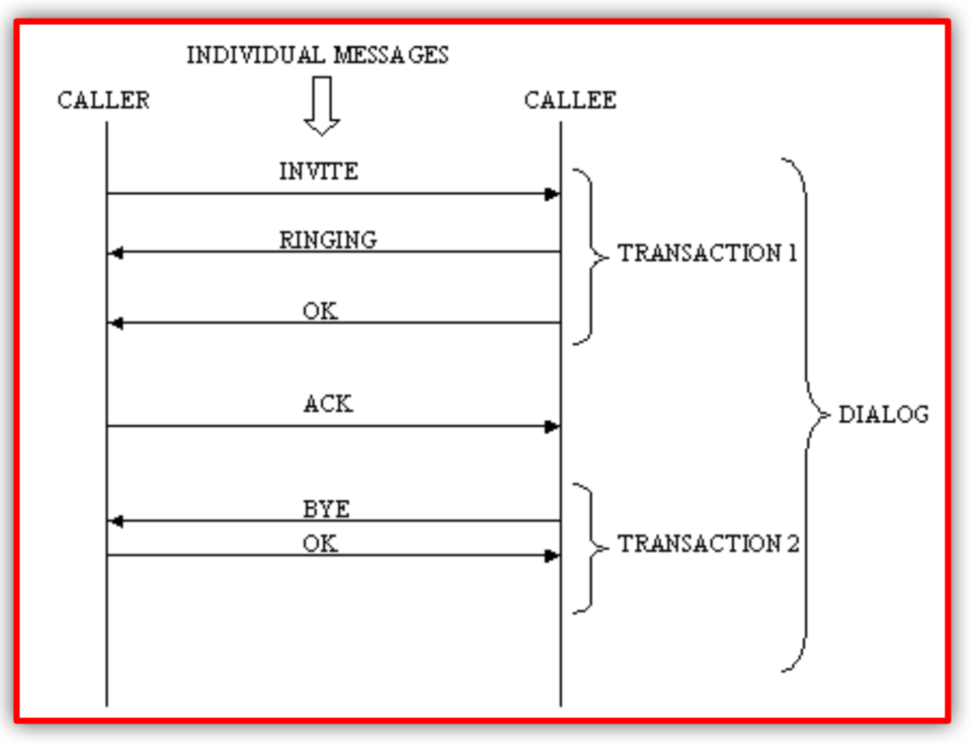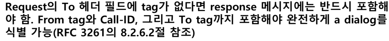 - 위의 그림과 같이 두 UA간에 Peer to Peer 관계가 일정 시간동안 유지되는 것을 다이얼로그(Dialog)라고 한다.
