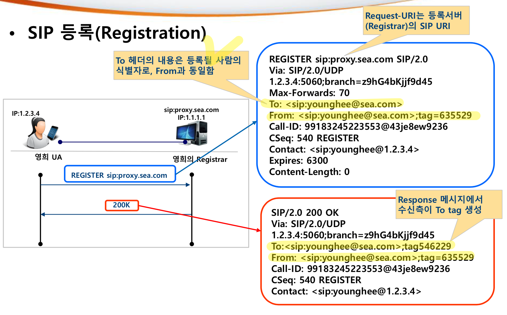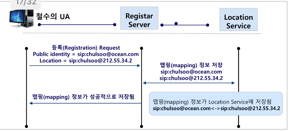 위와 같은 기능을 구현하기 위하여 SIP에서는 사전에 사용자로부터 등록 절차를 밟게하여 등록 서버(registrar)에 사용자 위치를 저장한다.