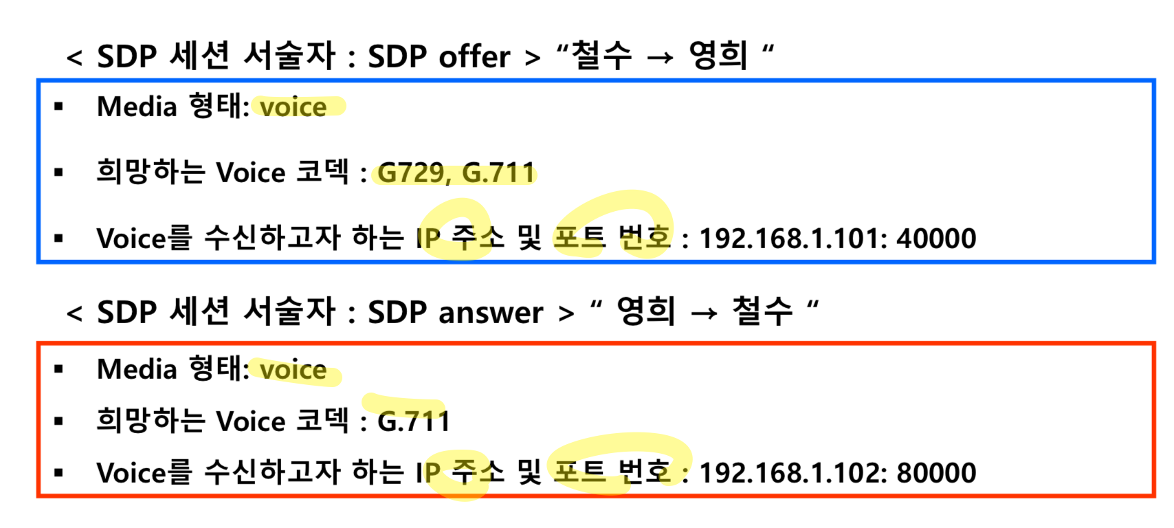 이 때 UAC와 UAS간에는 상호간에 어떠한 코덱을 사용할지에 대한 협상이 필요하다. 이 협상은 파라미터를 교환함으로써 이루어진다. 또한 상호간에 주소도 알려준다.