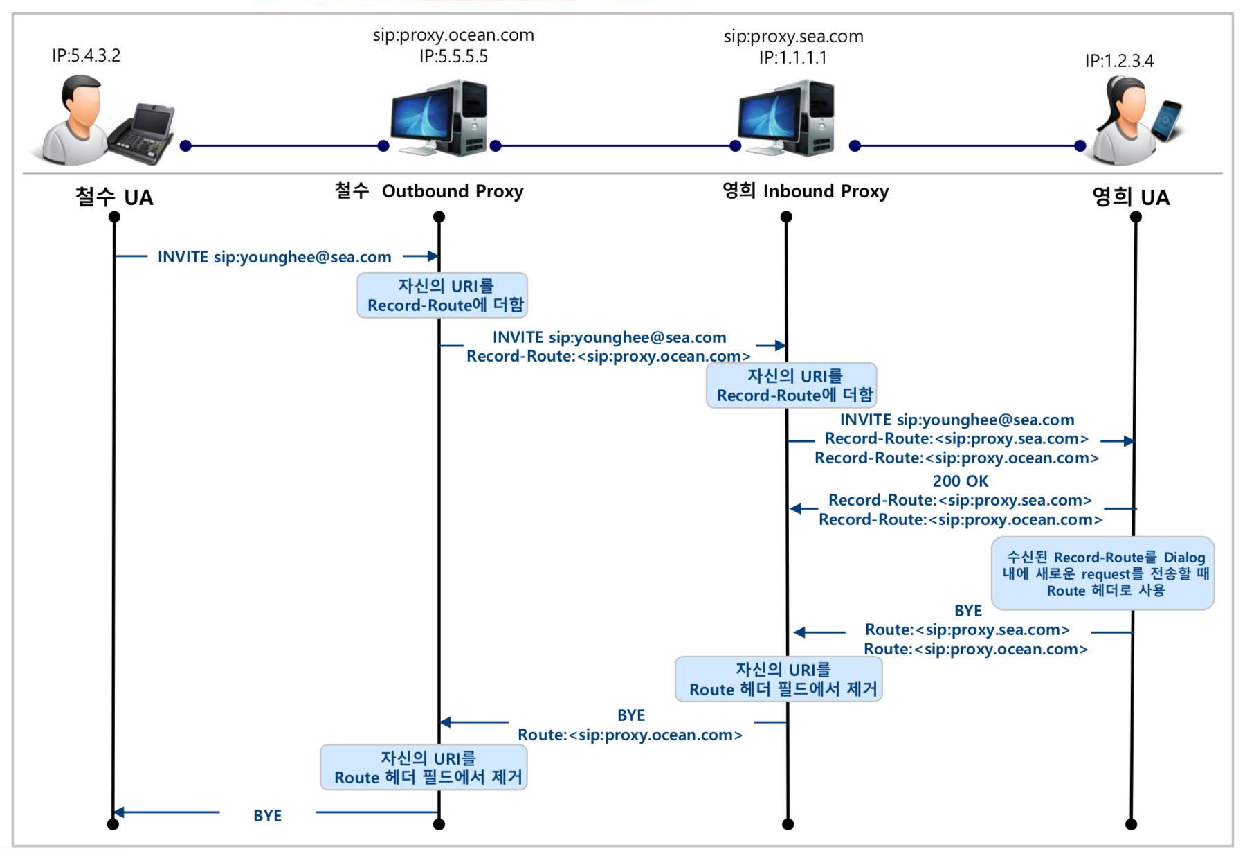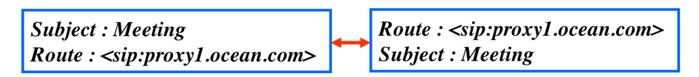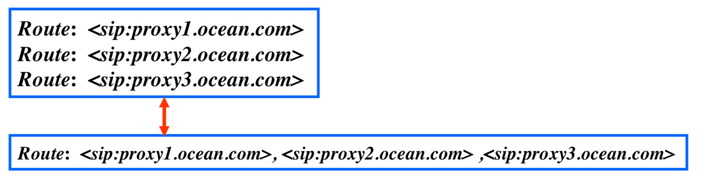 - 처음에 사용자가 전화를 걸고자 명시한 URI가 설정되고, 로컬들에 의해 route 헤더가 설정된다.