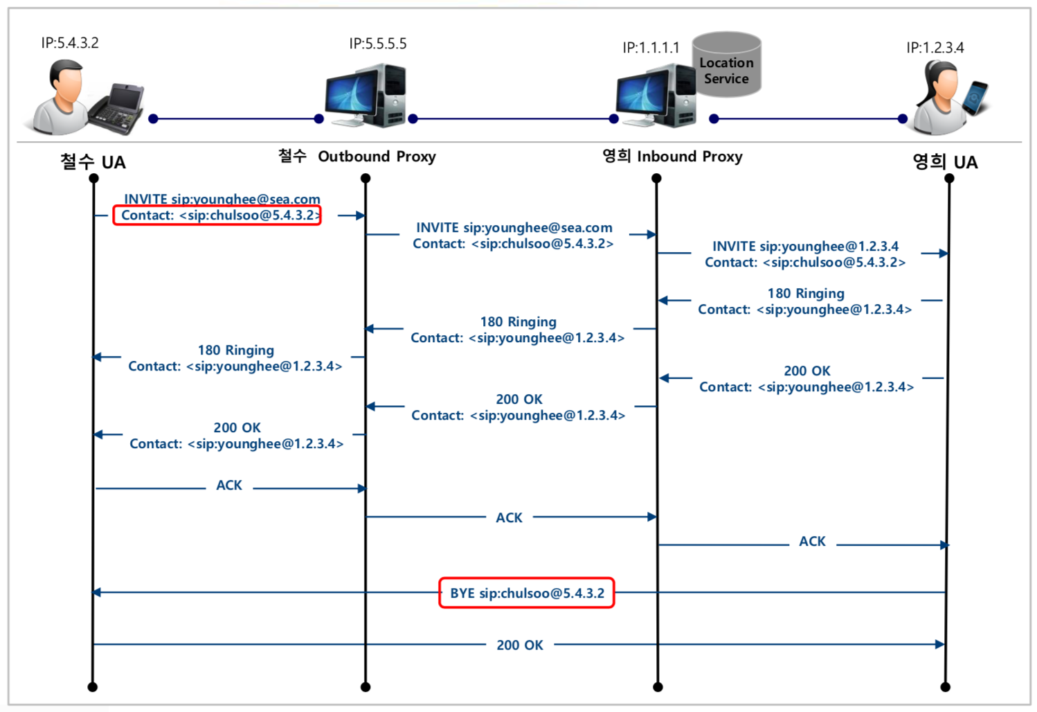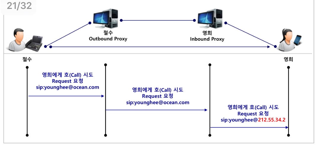 - 영희의 inbound proxy는 마찬가지로 Location 쿼리 후에 최종적으로 영희가 있는 Location URI를 구하여 전송한다.