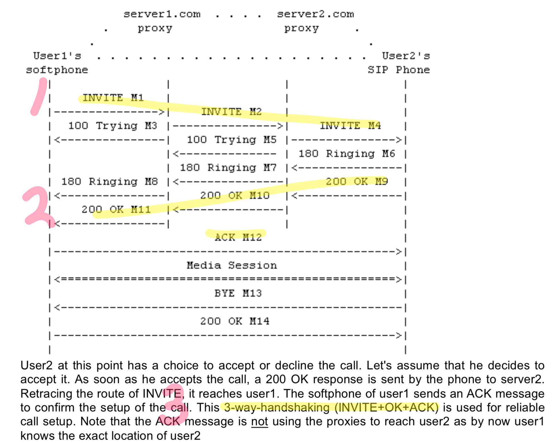 UAS는 최종 응답 메세지(final reponse)를 전송하게 되는데, 이 때 UAC가 최종 응답 메세지를 제대로 받았는지 확인하기 위해 ACK 메세지를 UAC로부터 받아야 한다. 즉 UAC는 최종 응답 메세지에 대한 ACK 메소드를 UAS에게 전송한다.