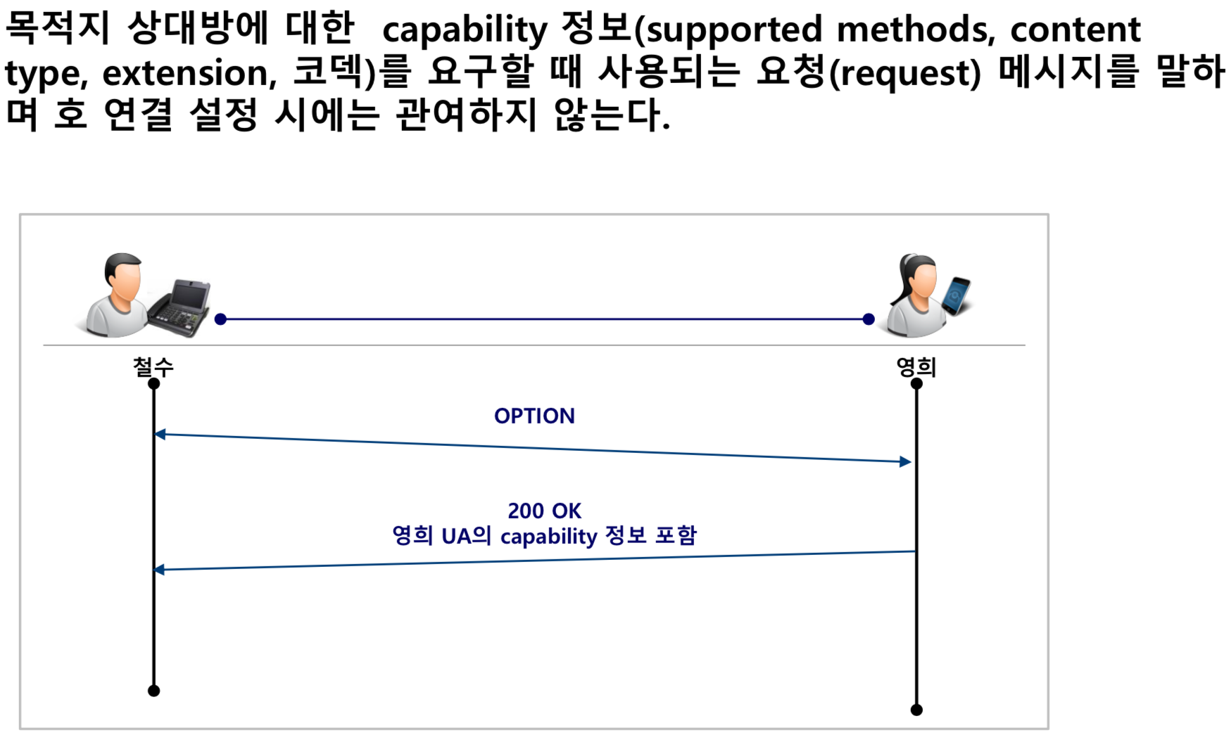 - 철수가 직접 영희의 IP주소로 SIP URI를 Request-URI로 설정한다. (TO 헤더 필드에도 설정한다.)