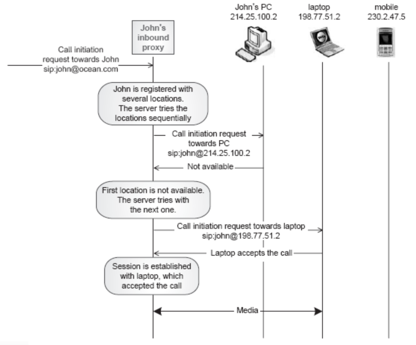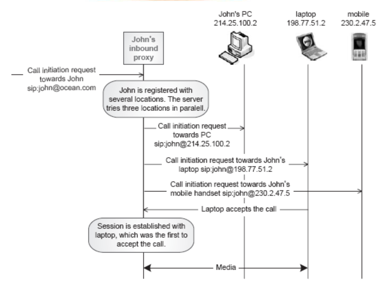 존에게 전화가 오는 상황이다. 이 때 존이 여러 개의 device로 위치가 등록되어 있을 때, 세션이 성립될 때까지 서버가 순차적으로 위치를 찾아나가는 방식이 Sequential Search이다.
