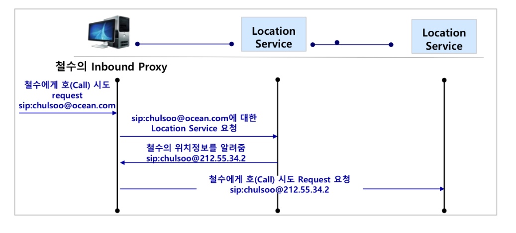 - 이럴 경우, 철수는 직접 Location Service에 쿼리하여 DNS만으로 영희의 inbound proxy의 Location SIP URI인 contact address를 구한다.(즉 사전에 영희가 registrar에 자신의 공인 식별자와 위치 정보를 등록해놓은 상태이다.)