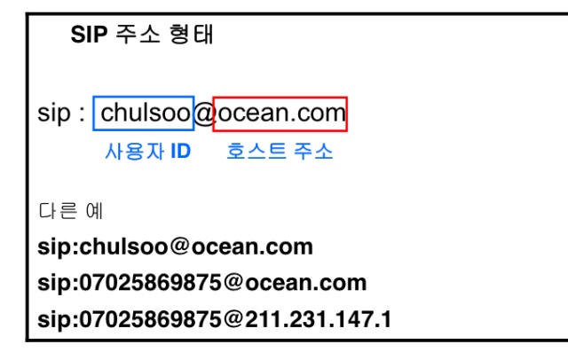 SIP URI(Universal Resource Idetifier)로 표현되며, 이 URI에 의해 SIP user나 SIP server가 식별된다.