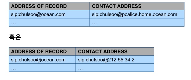 registrar는 받아들인 정보를 Location service라는 데이터베이스에 사용자의 공인 식별자와 사용자의 위치(contact address; FQDN(Fully Qualified Domain Name))를 매핑한다.