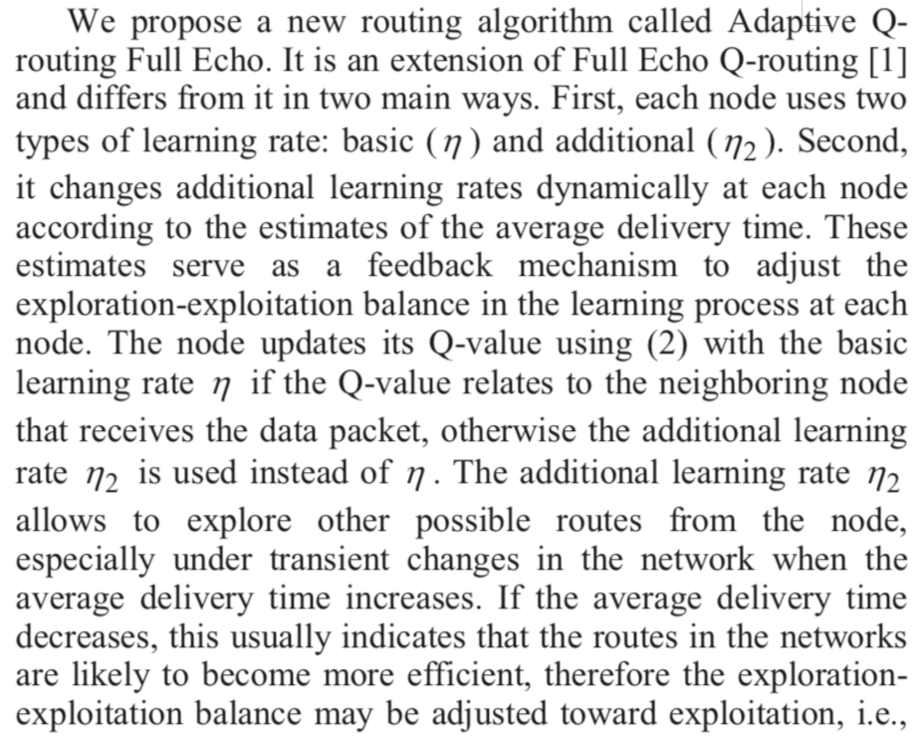 모바일 환경, 차량으로 이동하는 등의 그런 동적으로 네트워크가 바뀌는 상황(즉 네트워크 토폴로지가 계속해서 바뀌는 동적인 상황)에서도 통신은 효율적으로 이루어져야 한다. 이 논문에서는 이 목적을 달성하기 위하여 기존의 Full echo Q-Routing 알고리즘을 개선해서 Adaptive Full echo Q-Routing 알고리즘을 제안한다.