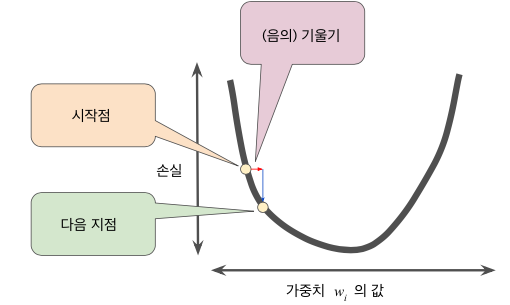 기울기는 벡터다. 벡터는 크기와 방향을 갖는다. 기울기는 항상 손실 함수 값이 증가하는 방향을 향한다. 따라서 기울기의 방향의 반대 방향을 향하게 하여 손실을 줄이는 방향을 향하게 해야 한다. 그리고 보폭의 크기에 해당 기울기를 적용하여(곱하여) 다음 지점을 결정하는 것을 반복함으로써 손실 함수를 감소시키는 방향으로 나아간다.