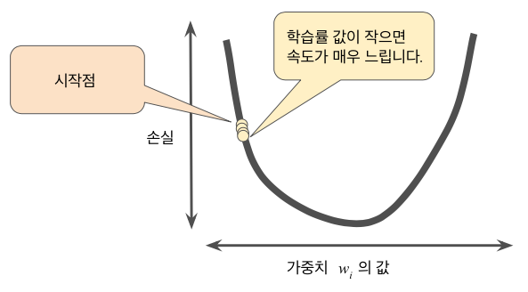 예를 들어 기울기가 2.5이고 학습률이 0.01이면 경사하강법 알고리즘은 이전 지점으로부터 0.025 떨어진 지점을 다음 지점으로 결정한다. 대부분의 머신러닝 프로그래머는 학습률을 미세 조정하는 데 상당한 시간을 소비한다. 학습률을 너무 작게 설정하면 학습 시간이 매우 오래 걸릴 것이다.