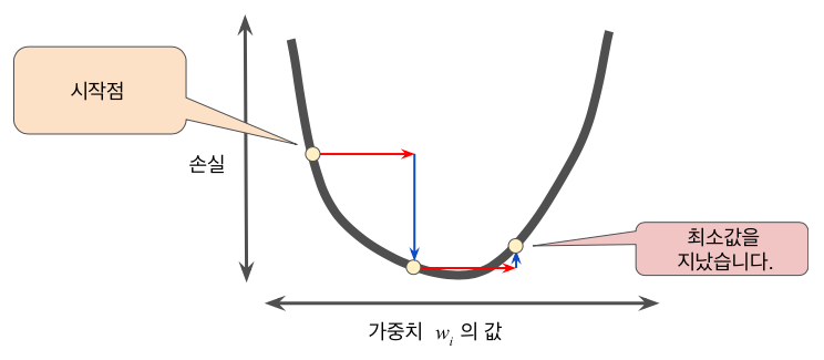 반대로 학습률을 너무 크게 설정하면 곡선의 최저점을 무질서하게 이탈할 우려가 있다.