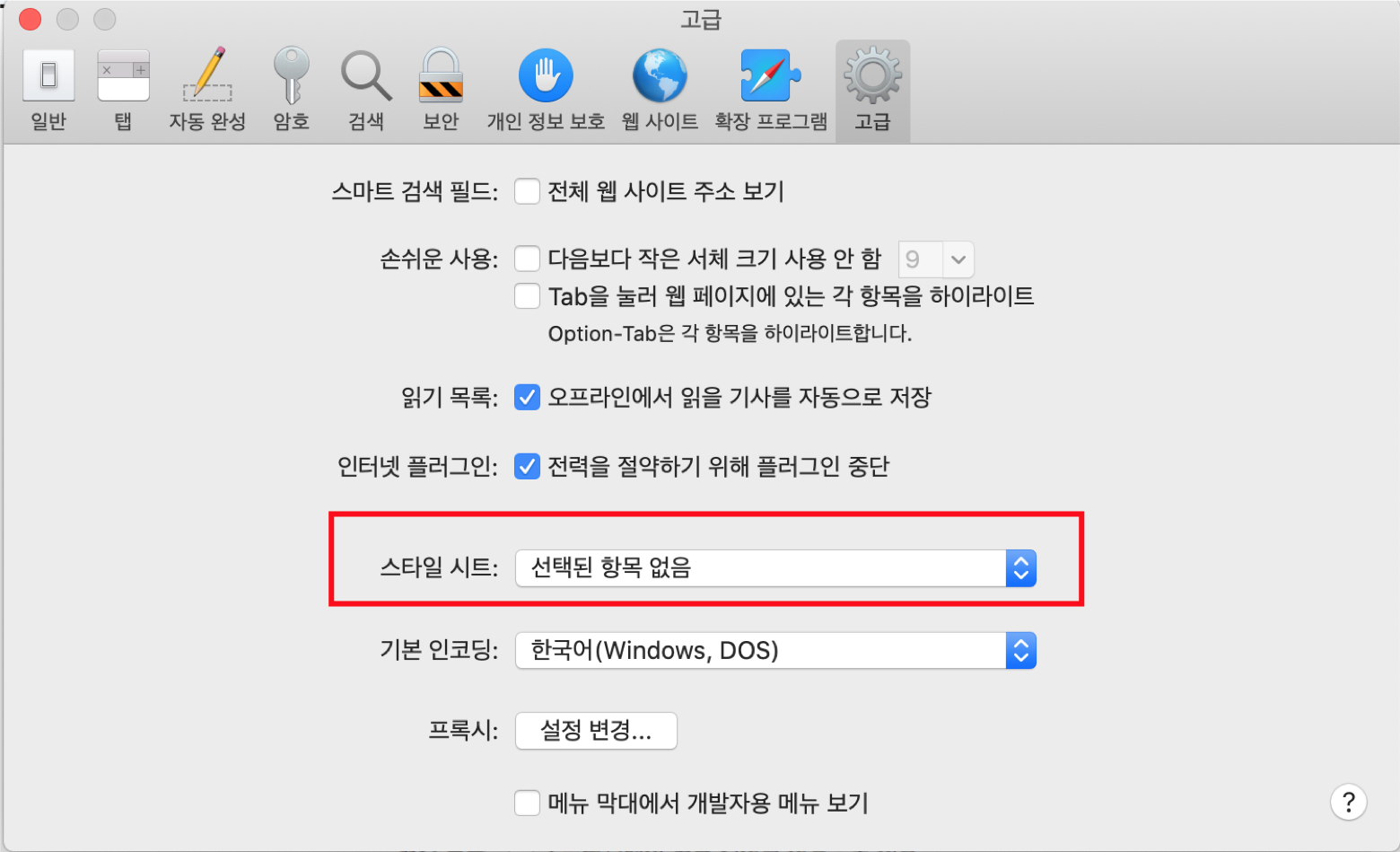 이제 이 css파일을 사파리 설정의 스타일 시트 부분에 넣어주기만 하면 끝!