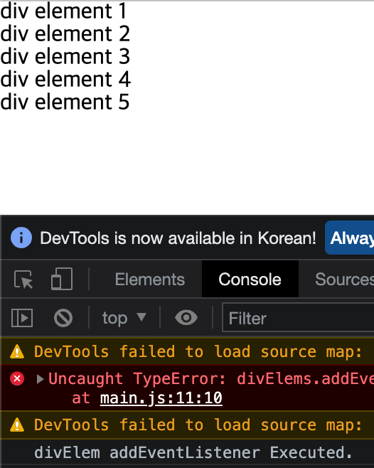 querySelectorAll도 적용했기 때문에 클릭했을 시에 두 개의 결과가 떠야 한다. 그러나 querySelectorAll로 찾은 요소에 대해서는 위와 같이 코드를 작성할 경우 클릭해도 핸들러가 작동하지 않는데, 그 이유는 querySelectorAll는 일련의 여러 요소들을 유사 배열로 반환하기 때문이다. 따라서 forEach를 이용하여 각 요소에 하나하나 접근해야 한다.