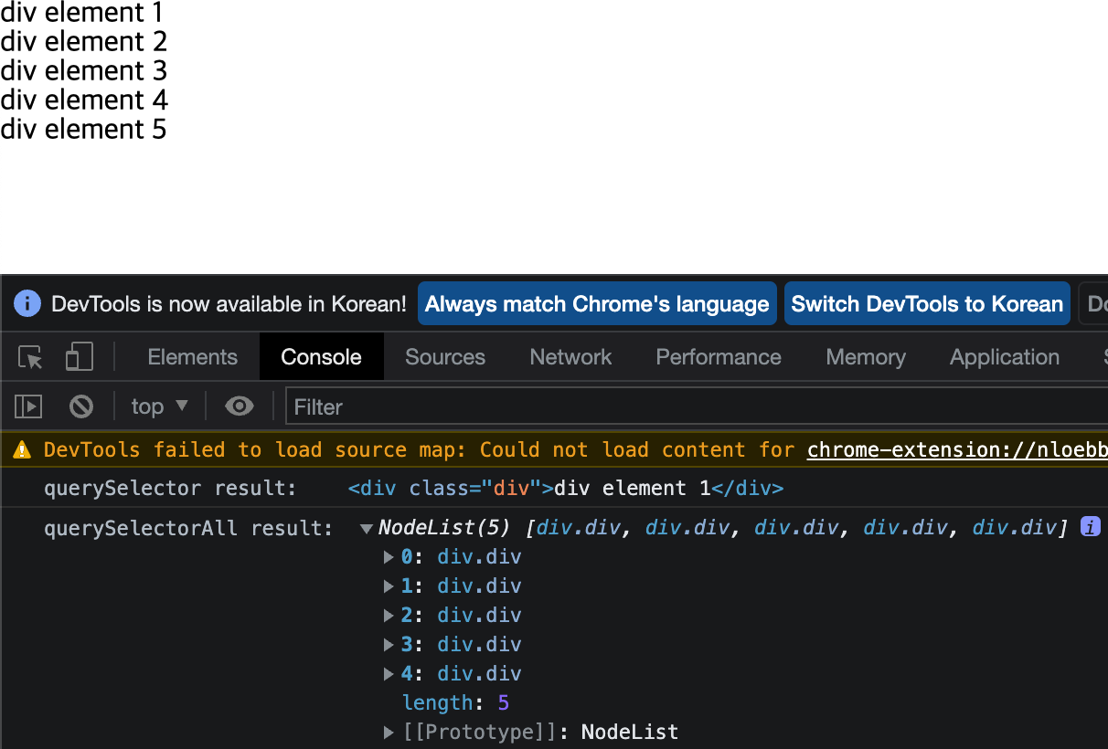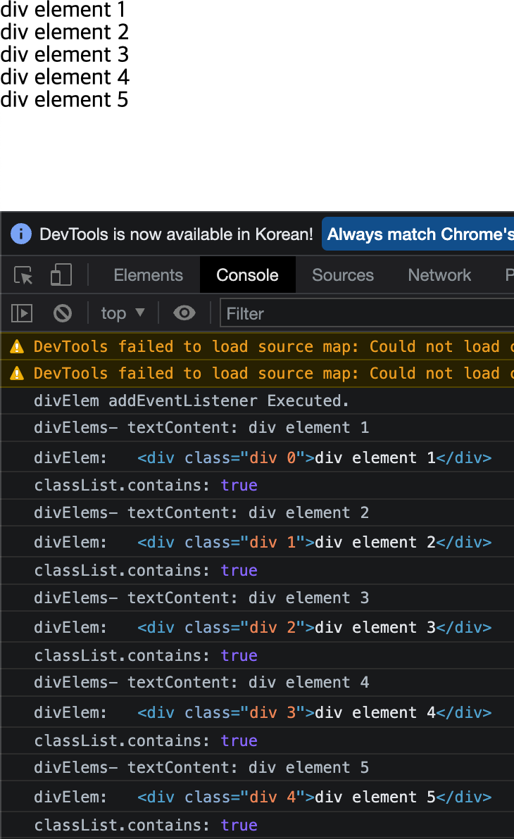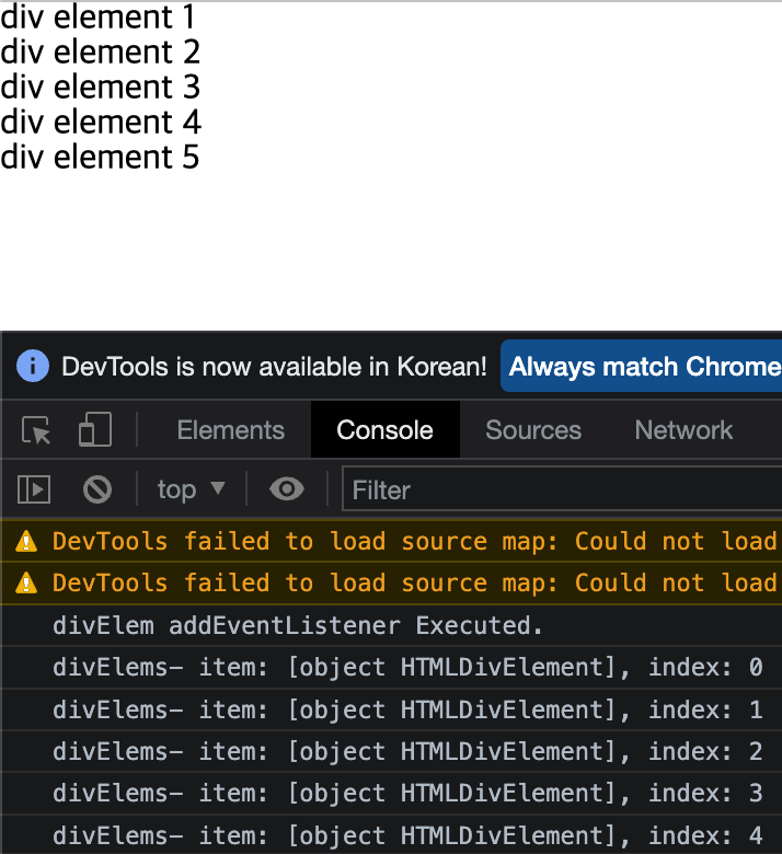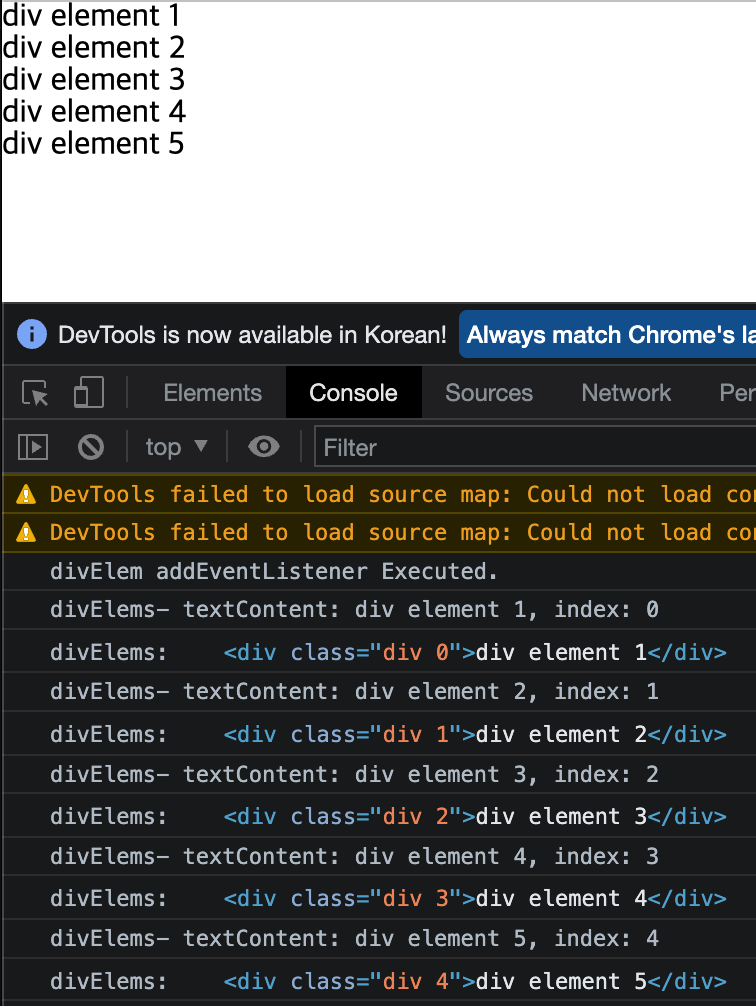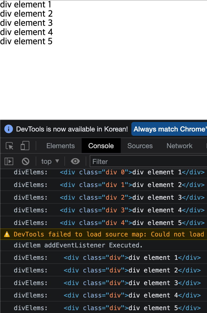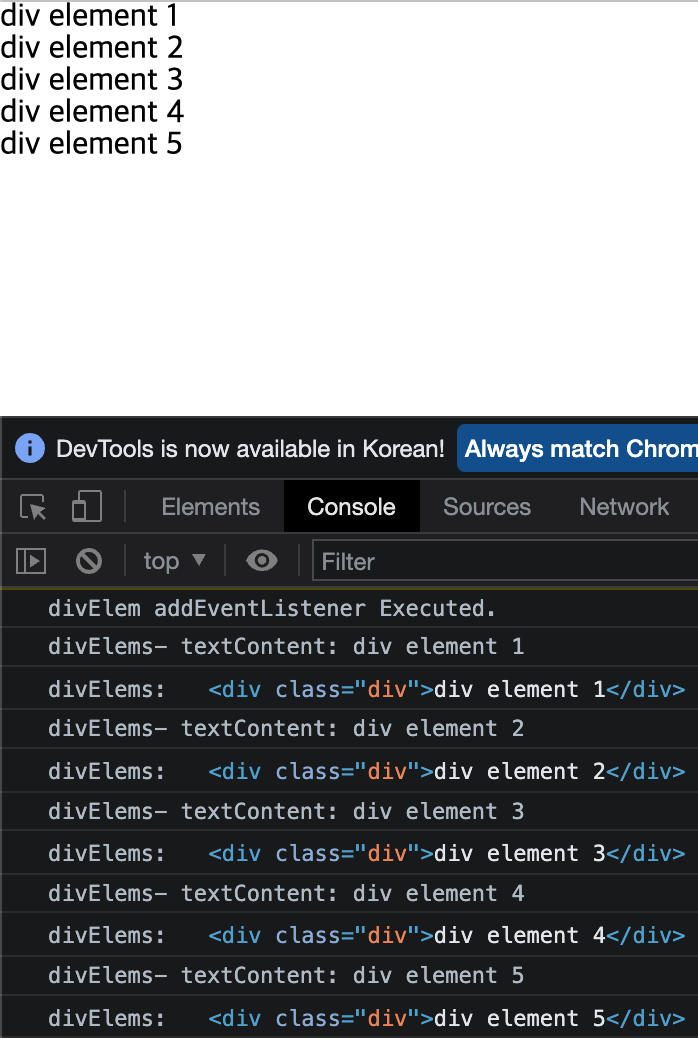 div element 1을 클릭할 경우 querySelector에 대한 addEventListener가 실행된 결과와 querySelectorAll에 대한 addEventListener가 실행된 결과가 모두 보여지게 된다.