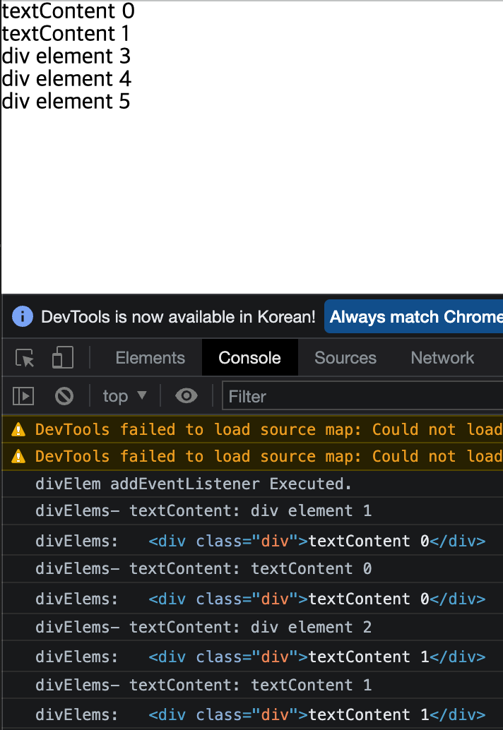 textContent를 이용하면 특정 요소가 가진 텍스트를 반환받을 수도 있고, 초기화 할 수도 있다. 위 예시는 div element 1, 2까지를 클릭한 결과로서 텍스트 자체가 변경된 것을 확인할 수 있다.